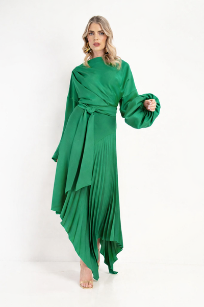 Kevan Jon Mila Sleeve Knee dress has a soft draped bodice with full length sleeves, along with a skirt that falls to an asymmetric hemline with a pleated insert to the left side giving added interest to this stunning dress. The addition of a removable sash allows you to accentuate the waist In luxe satin crepe fabric . Machine washable on delicates cycle