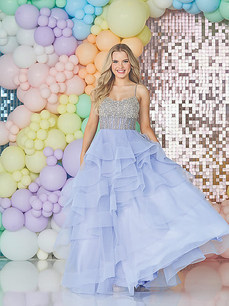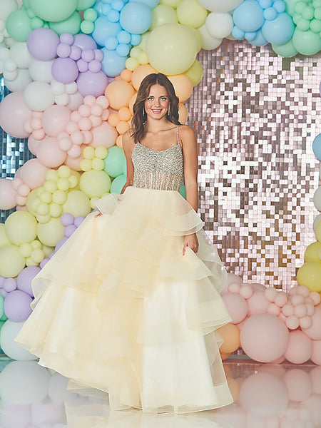 Elsie diamante layered tulle ballgown prom dress by Tiffanys pink, blue, lemon