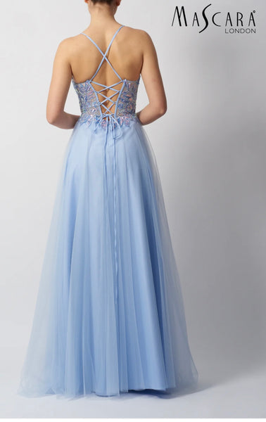 This gown features a irredescant sequin boddice and strappy back with a full tulle ballgown skirt with side split