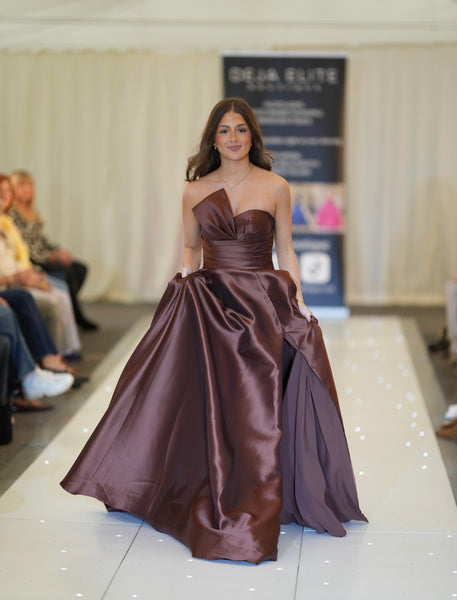 Our ‘most wanted’ SLOANE ballgown features a ruched fold boddice with peaked bustline finish and a full skirt with split in luxe mikado satin . .
